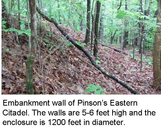 At Pinson, the large circle straddles a couple of ravines and Tennessee archaeologist Mark Norton has suggested it actually served to funnel rainwater into the western half of the enclosure where it may have collected into an artificial reservoir. He compares it to structures built by modern farmers in Tennessee to create cattle ponds.