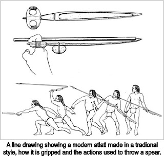 The Ohio Atlatl Association will hold demonstration work shops and accuracy competition this weekend (July 14-16) at Flint Ridge State Memorial near Brownsville, Ohio. Atlatls are hooked sticks or handles used to throw flint tipped spears or long shaft darts and the distance and accuracy achieved by an accomplished atlatlist is amazing. I have seen a steel tipped atlatl dart actually penetrate a car door! The modern use of the word atlatl is derived from the Aztec word ahtlatl meaning spear thrower. However, atlatls were used for thousands of years in both the Old World and New Worlds before the advent of the bow and arrow.