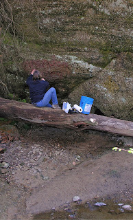 Here Karen is taking it easy not really. She is utilizing a handy fallen dead log to access some spray paint about six feet above the rocky stream bed. This section required a hand-powered wire brush and a little acetone. Fortunately, there was not much lichen or moss on this spot, and paper towels kept the acetone from dripping into the stream below. The bucket caught used towels etc.