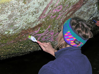 Here Karen Hassel is taking even more care, using an even smaller brush. The pink in this image is spray paint, and the pale, pastel green areas are living lichen plants. The smaller brush is being used to try and leave as much of these natural lichens remaining as possible. At the same time, we tried not to leave behind a bare rock outline of the lettering between the lichens. It took some finesse and care to leave the site looking good! Karen, with her artist background, was especially helpful with this.