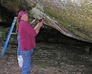Maria Pease is using a soft, kitchen-type scrub brush to clean off some spray paint from the rock shelter wall. We were committed to use the least invasive and destructive technique possible, as we did not want to cause even more harm to the site than the spray paint itself did. Fortunately, some of the spray paint came off the rock walls fairly easy. Occasionally, dipping the scrub brush in plain water helped a little more. In a number of places, this was all that was needed.