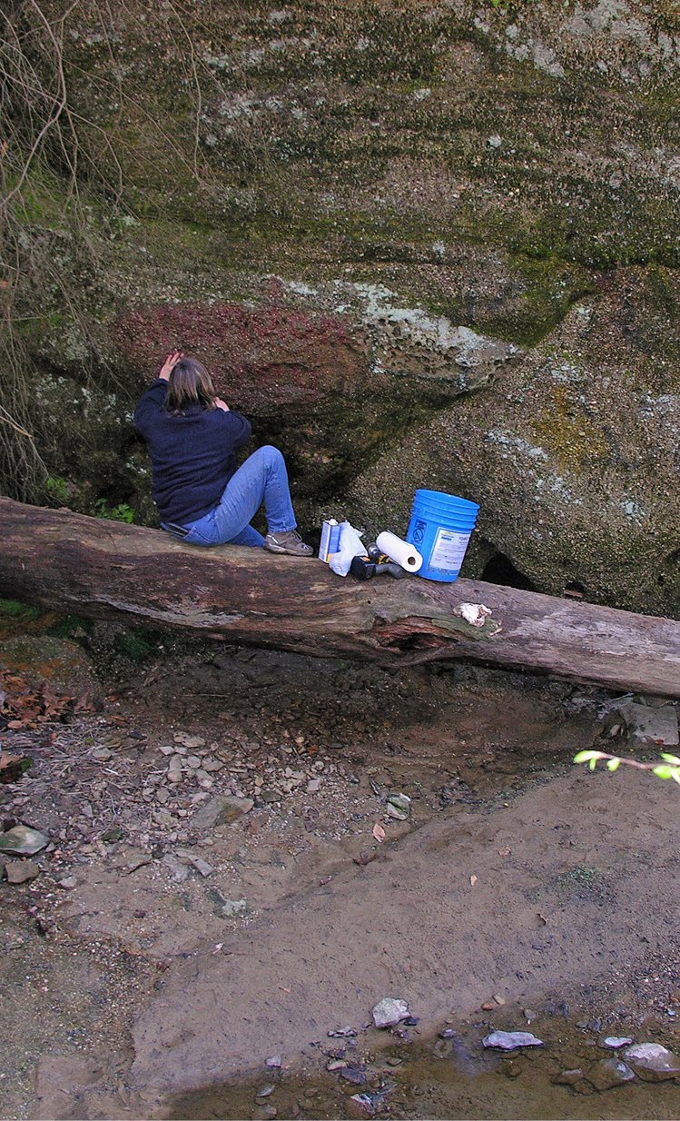 Photo #1 Maria Pease is using a soft, kitchen-type scrub brush to clean off some spray paint from the rock shelter wall. We were committed to use the least invasive and destructive technique possible, as we did not want to cause even more harm to the site than the spray paint itself did. Fortunately, some of the spray paint came off the rock walls fairly easy. Occasionally, dipping the scrub brush in plain water helped a little more. In a number of places, this was all that was needed.