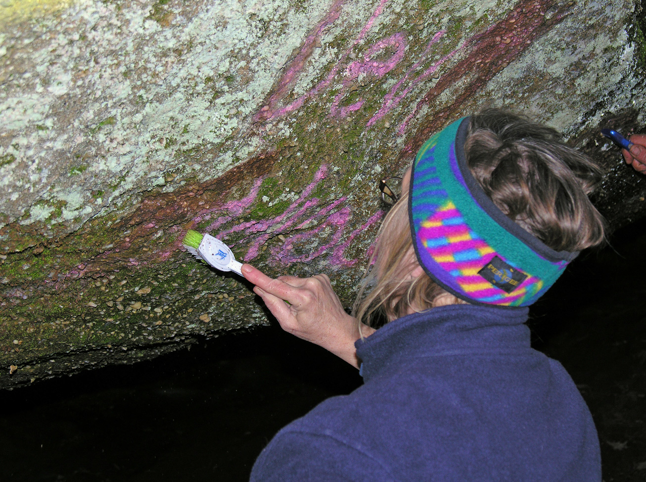 Photo #2 Here Karen Hassel is taking even more care, using an even smaller brush. The pink in this image is spray paint, and the pale, pastel green areas are living lichen plants. The smaller brush is being used to try and leave as much of these natural lichens remaining as possible. At the same time, we tried not to leave behind a bare rock outline of the lettering between the lichens. It took some finesse and care to leave the site looking good! Karen, with her artist background, was especially helpful with this.