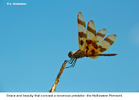 At least it is close enough to “Dragonfly Season” for the press to begin posting articles about these fascinating critters. The April 1st New York Times (April 2nd for the web-based issue) hosted an article with several videos by Natalie Angier, titled “Natures Drone, Pretty and Deadly”. Her article really has a couple of themes reflective on the complexity of these fascinating insects. Her first theme is how voracious they are as predators. She contrasts dragonflies with African Lions, which have a 25 percent success rate in their hunt, and Great White Sharks, which have a 50 percent success rate. Dragonflies typically catch their prey on 95 percent of their attempts! Angier further reports that one Harvard biologist who watched a dragonfly in a laboratory eat 30 flies in a row–and stopped only because the researchers ran out of flies to feed it!