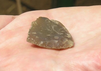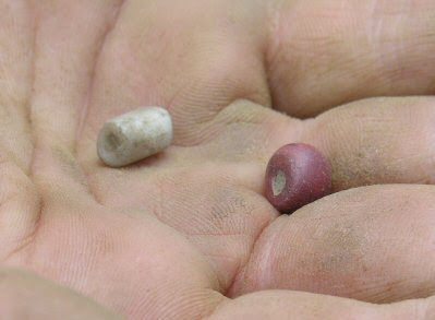 Today they found several artifacts, both prehistoric and historic in nature. Of particular interest were a french gun flint (photo 2) and two glass beads (photo 3), both of which were located in the same unit. In addition to the artifacts, one of the quarters held two post moulds and another feature (photo 4). You can see the post moulds and chinking stones (stone used to secure the post in place) at the bottom of the unit. The other feature stretches across the top of the whole unit. Now the big question: are thefeature and post moulds associated with Pickawillany structures or are they from an older occupation? At this point that question has yet to be answered but hopefully at the end of the investigation the we will know more than we do presently.