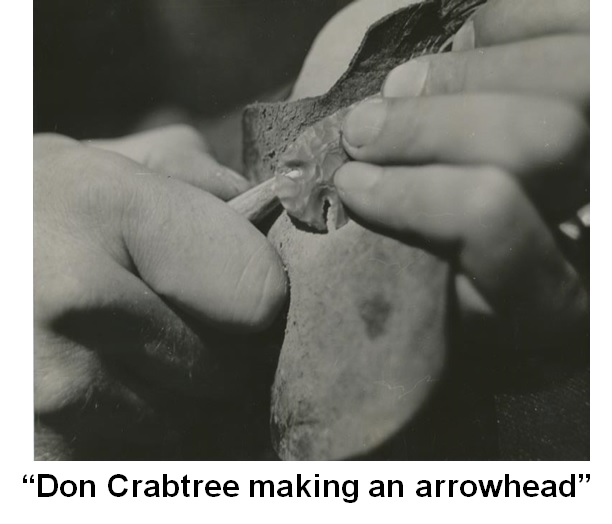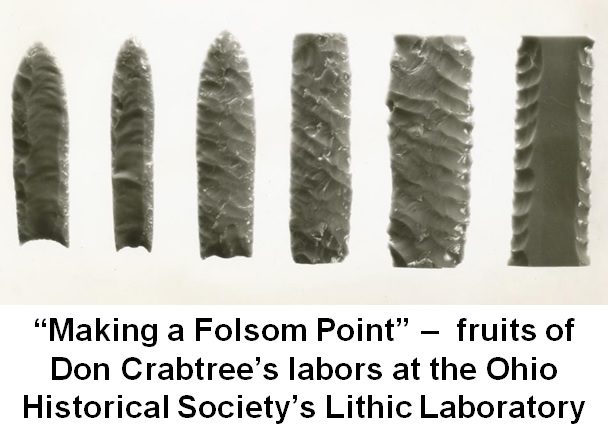 H. Holmes Ellis, Research Assistant at the Ohio Historical Society’s Lithic Laboratory for the Eastern United States, in his annual report of the Lab’s activities for “the year April, 1941 – April, 1942, described one of their most important achievements for the year: “The Lithic Laboratory discovered a remarkably able flint chipper, Don E. Crabtree of Twin Falls, Idaho, and acquired his services for two months in the early summer of 1941. Mr. Crabtree, during his stay in Columbus, contributed largely to the rediscovering of two elusive ‘lost arts,’ Folsom fluting and the manufacture of flake knives. Achieving either one of these difficult techniques would have been worth his trip east; we had not hoped for both successes.”