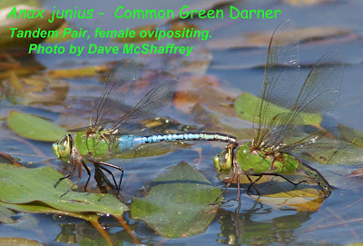 The other Ohio population of green darners is derived from individuals that laid eggs last summer, but completed their entire life cycle in a single season, emerged as adult dragonflies in August or early September, then migrated south. At least that is the strongly supported hypothesis that is widely accepted by dragonfly researchers, but not fully proven yet. A few years ago some experiments were done with tiny radio transponders glued to the body of half a dozen green darners. The researchers were able to track them for only about six days but as suspected, they moved south in spurts, resting in-between at various ponds and wetlands. It is hypothesized that these may move all the way to areas along the Gulf Coast. Huge migratory swarms have been noted from time to time one observed by Summit County naturalist Mike Green was estimated to contain between 500,000 and 1,000,000 dragonflies! Again, we presume these breed and lay eggs in southern waters and overwinter in the deep south as larvae. When those southern waters warm enough, they emerge and migrate north.