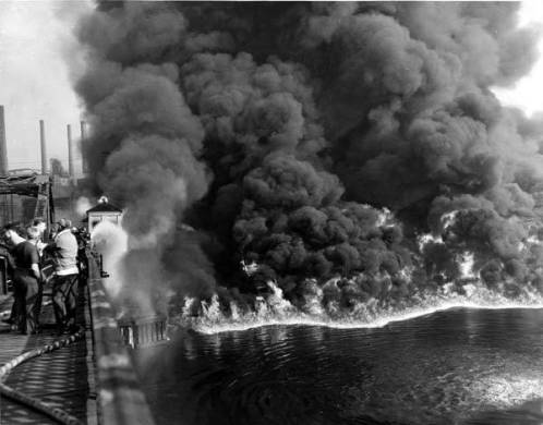 Photograph of the 1952 Cuyahoga River Fire from the collections of Cleveland State University Library.