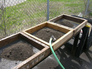backlog of soil samples in storage and process them by water screening. Water screening uses a lot of water and produces a lot of mud, so it is an activity that is better undertaken out of doors in warm weather. It is actually a simple operation, as seen in the accompanying images. The soil is poured into a series of 1/8 inch mesh sieve boxes and after hand picking the larger items from the screen the samples are sprayed with a hose until all the soil is washed away. Fortunately midden soil is typically loose and organic, almost like potting mix and as a result it doesnt take long for water to do its thing. The Ft. Meigs samples produced a rather mundane looking residue of fish scales, charcoal, small