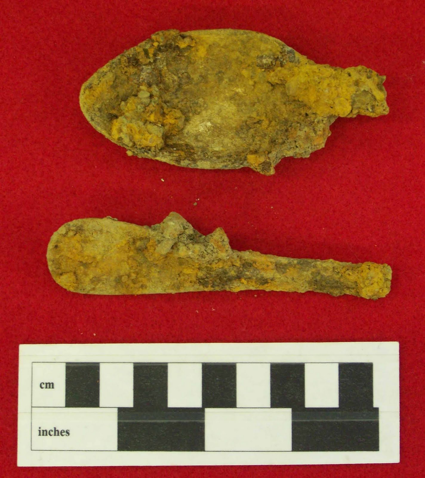 In one unit the team discovered traces of what is likely to prove to be one of the walls of the original fort in a miraculously preserved patch of ground just across the street from the restored fort. Artifacts found in these excavations include the center band from a 1766 Charleville Musket, a musket ball and two pieces of a broken spoon, all of which relate to the period of the Indian Wars and so either are objects left behind in the wake of St. Clair’s defeated Army or material discarded by Wayne’s men during the construction of the fort. This just goes to show that important traces of the past can be preserved almost anywhere!