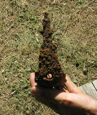 Features 6 and 10 were opened today (photo 2). Feature 6 seems to be getting morecomplex and may not be just a post mould but could be part of a larger feature. Feature 10 appears to be a trash pit at this point. Artifacts from this feature today includes animal bone, flint flakes, two small white seed beads and a gun buttplate with a fleur-di-lie design (photo 3).
