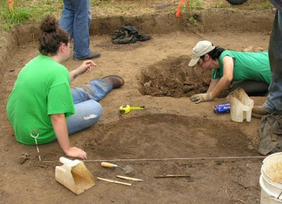 The second excavation area contains several features that are yet to be assigned feature numbers. One thing we did learn though; the large metal detector hit from 2002 turned out to be a Budweiser can, likely thrown in by people recovering metal artifacts from the property before 2000. Drats! However, this same feature has yielded Pickawillany era artifacts so even though the area had been disturbed in the past the feature can still help us understand how Pickawillany inhabitants lived. Today we recovered animal bone, flint, glass fragments and a nice french gun flint from this area of investigation (photo 4).