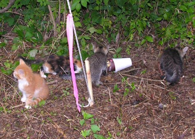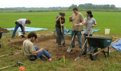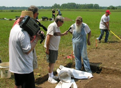 The excavation was visited by the local cable access show “Around the Farm” which highlights activities and information about the John Johnston Farm and Indian Agency (photo 1). Both excavation areas have been expanded to better expose features (photos 2-3). Artifacts such as brass arrow points, gun flints, and a large blue glass bead (photo 4) have been found. In addition, a family of cats (two adults and 6 kittens) have provided entertainment during lunch and water breaks (photo 5). By the way things are going feature investigations will begin very soon!
