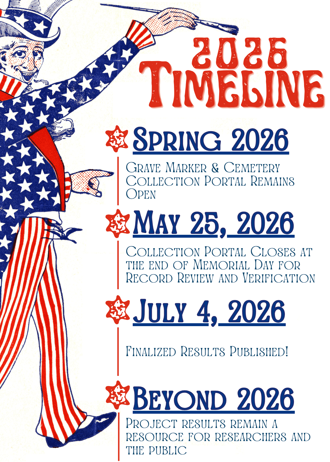 The collection of grave marker and cemetery information by Public Researchers will continue through May 25, 2026. At that time, the Grave Marker and Cemetery Portal will close so that the results can be reviewed, verified, and finalized. The completed survey results will be published by July 4, 2026.