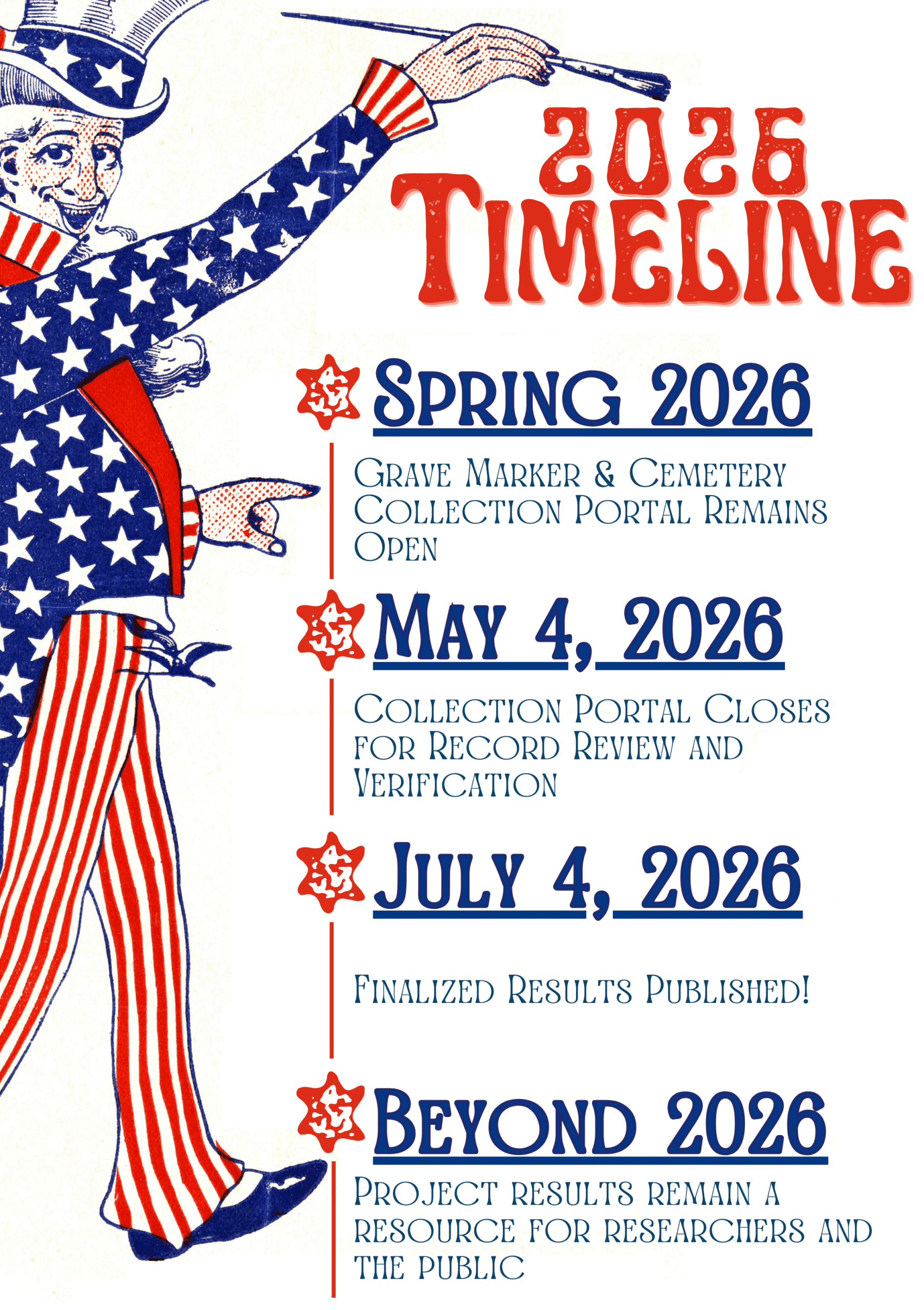 The collection of grave marker and cemetery information by Public Researchers will continue through May 4, 2026. At that time, the Grave Marker and Cemetery Portal will close so that the results can be reviewed, verified, and finalized. The completed survey results will be published by July 4, 2026.