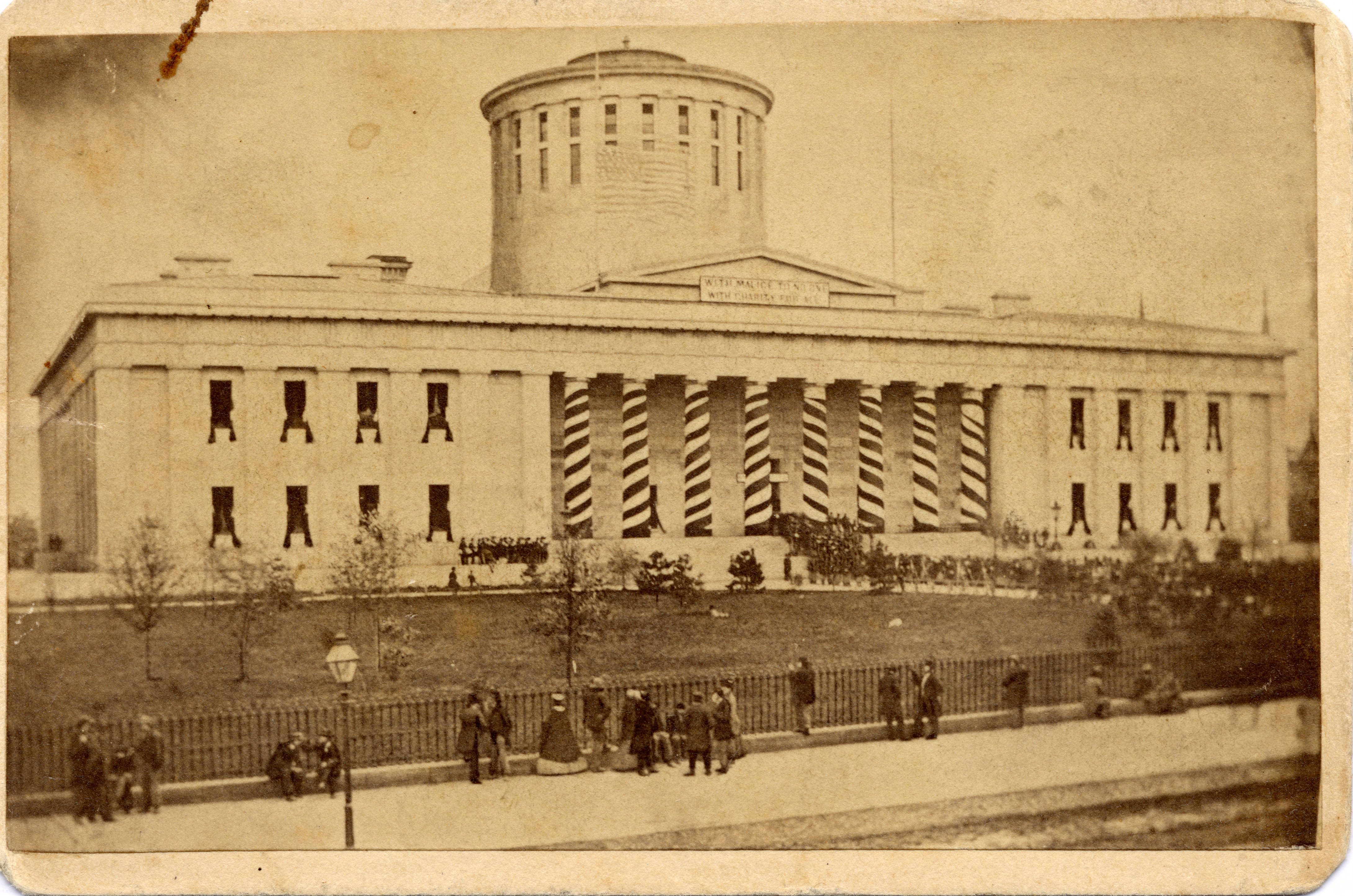 Eventually news of Lincoln’s death reached Ohio. Here you can see the Ohio Statehouse decorated in anticipation of the coming of Lincoln’s funeral train.