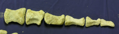 For a variety of geologic reasons the Great Lakes region rich in such remains, enough so that the mastodon is Michigan’s state fossil. As we all know, rich is only relative and the recognized discovery of any fossil bones is uncommon. Discovery of complete or nearly complete skeletons remain as extremely rare occurrences. It should be easy to understand then why a phone call indicating that another specimen may have been discovered would create a measure of excitement. I later talked to the contractor and he informed me that the next week he had business in Columbus and would be glad to bring them by. What he presented appeared at first glance to be several cartons of chalky white limestone nodules. However he took several pieces from one carton and laid them in a line and said that was pretty much how he found them. It looked for all the world very much like articulated giant flanges or finger bones or perhaps a series of bones from the tail of some great beast or “Stone-a-Saurus” as seen below. This series of bone-shaped objects total nearly three feet in length. However the chalky limestone material they were composed of was nothing like mastodon bone, or any other megafauna bone, which comes out of the ground as exactly that – bone! Even at several thousands of years old they simply aren’t of sufficient age to have lithified or turn to stone. That process that takes precise environmental/geological requirements not to mention millions upon millions of years.
