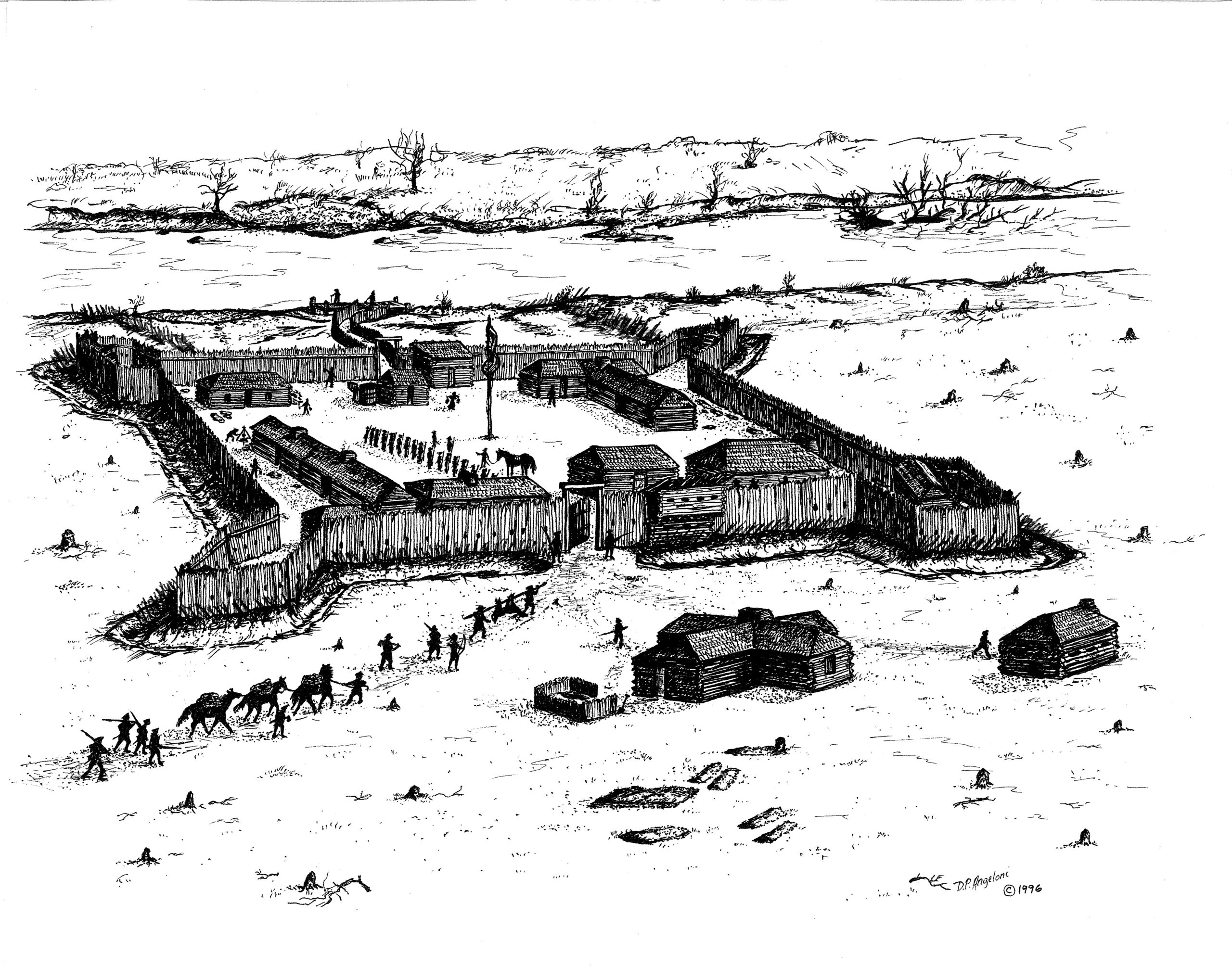 Using troops from the 8th Pennsylvania Regiment, the 13th Virginia Regiment, Virginia militiamen, and a small group of dragoons (mounted troops that dismounted to fight as infantry rather than fighting from horseback as cavalry would), McIntosh followed the Great Trail west, using the same route that General Henry Bouquet followed fourteen years earlier during the later stages of the French and Indian War (1754-1763). In November 1778, McLachlan selected a site along the west bank of the Tuscarawas in a broad river valley, in the same vicinity that Bouquet had ordered fortified storehouses to be built before continuing further south.